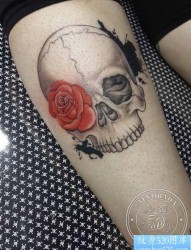 腿部骷髅头玫瑰花纹身图案