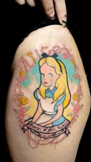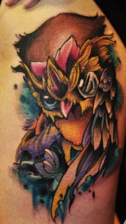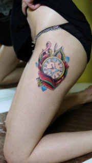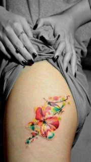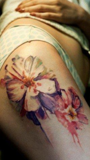 女生腿部唯美漂亮的彩色喷墨花卉纹身图案