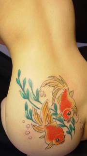 美女腰臀部彩色小金鱼纹身图案