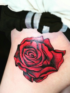 落在臀部的一朵红玫瑰纹身图案性感诱人