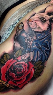 大腿上兔子玫瑰纹身图案