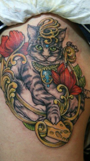 女性臀部彩色猫咪纹身图案