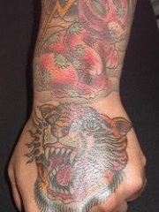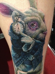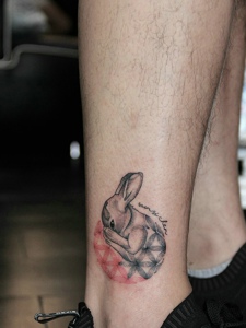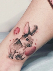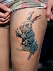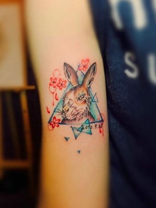 男子背部兔子纹身图案_红蓝白彩色纹身兔子图片