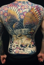 满背亚洲风格的多彩兔子和花朵鹰纹身图案