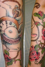 小臂彩绘兔子玫瑰和时钟纹身图案