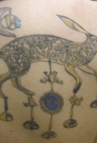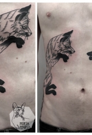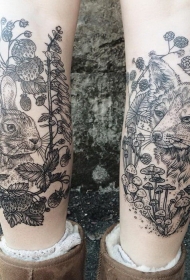 小腿黑白雕刻风格兔子与狐狸植物纹身图案