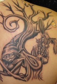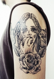 大臂雕刻风格黑色女人与猫兔子和玫瑰纹身图案