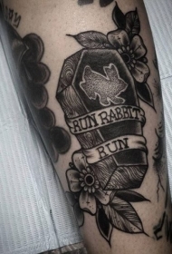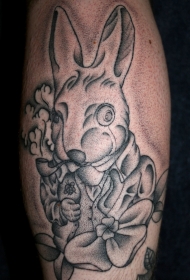 小腿黑色点刺爱丽丝仙境兔子纹身图案
