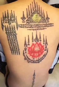 纹身后背女 女生后背上莲花和梵文纹身图片
