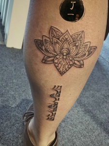 梵花与梵文一起的腿部纹身刺青