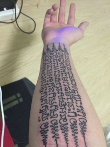 手臂上细致而繁多的梵文刺青