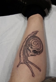 男生小腿上黑灰点刺简单线条骷髅和动物蜗牛纹身图片