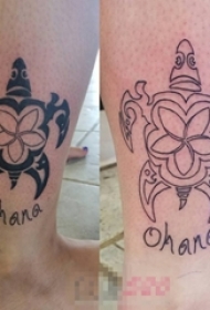 男生小腿上黑色几何线条花朵和乌龟覆盖纹身图片
