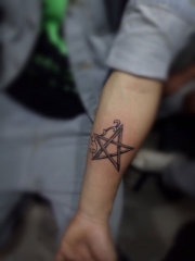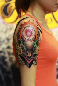 另类复古鹿头像和五芒星彩绘手臂纹身图案