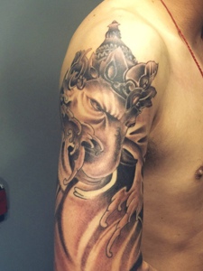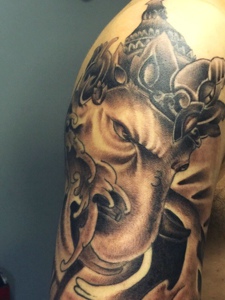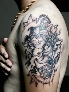 经典有范的大臂黑灰大象神纹身图案