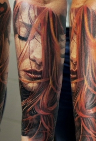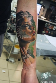 小臂写实的彩色女性肖像纹身图案