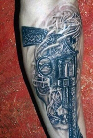 手臂黑灰风格手枪与骷髅烟雾纹身图案