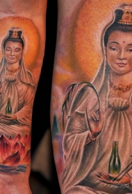 手臂美丽的彩色观音与莲花座纹身图案