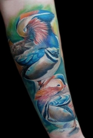 手臂写实风格彩色美丽的鸳鸯纹身图案