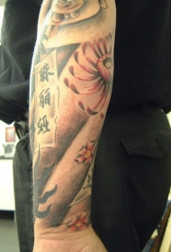 小臂新风格的彩色骷髅与鸟类纹身图案