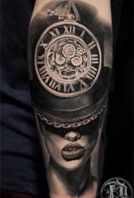 小臂黑灰风格机械时钟结合女性帽子纹身图案