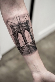 小臂写实黑色著名建筑物和伤心女孩纹身图案