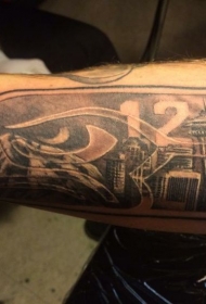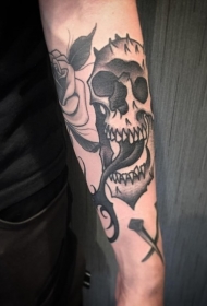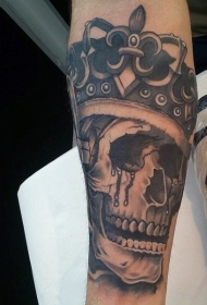 小臂黑灰风格的人类骷髅与皇冠纹身图案