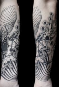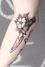 小臂雕刻风格黑色匕首与花朵纹身图案