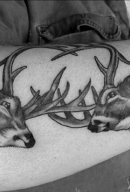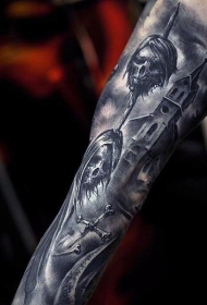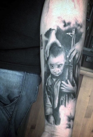 手臂黑色十字架与悲伤男子肖像纹身图案