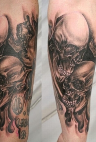 手臂恐怖风格黑色人头与毛骨悚然的房子纹身图案