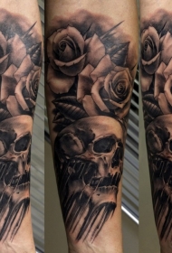 手臂奇妙的黑色玫瑰花结合骷髅纹身图案