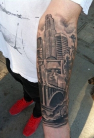 手臂写实黑色的城市景观纹身图案