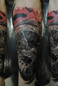 惊人的现代风格旧机械时钟纹身与乌鸦小臂纹身图案
