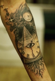 小臂黑色部落金字塔与鸟和时钟眼睛纹身图案