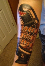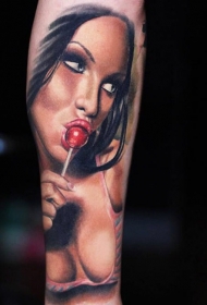 手臂彩色逼真吃棒棒糖的女人纹身图案