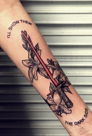 手臂西斯光剑与鲜花纹身图案