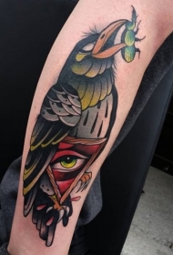 手臂彩色大乌鸦与三角眼纹身图案