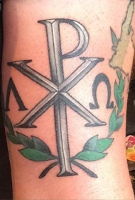 手臂彩色基督字母符号与叶子纹身图案