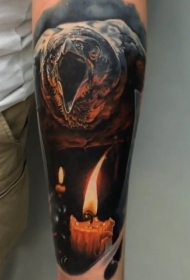 手臂逼真自然的彩色乌鸦纹身图案