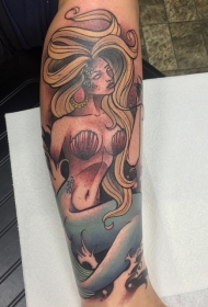 手臂彩色老学校风格手绘美人鱼纹身图片