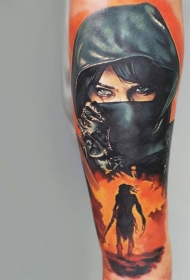 手臂彩色逼真的女战士肖像纹身图案