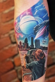手臂彩色未来风格城市景观和行星纹身