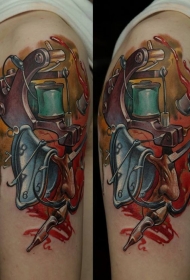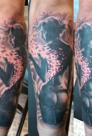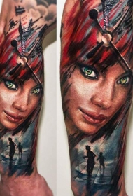 手臂彩色女子肖像与手枪纹身图案