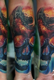 手臂现代风格的彩色燃烧的骷髅头纹身