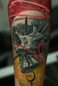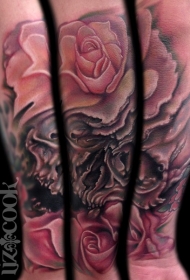 手臂彩色漂亮的玫瑰与人类头骨纹身