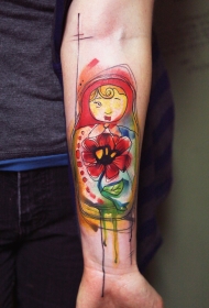 手臂水彩画风格的彩色俄罗斯套娃纹身
