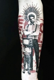 手臂壮观的彩色蝙蝠侠与刻字纹身图片