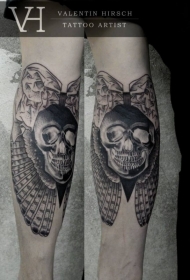 手臂黑灰令人毛骨悚然的人类头骨与翅膀纹身