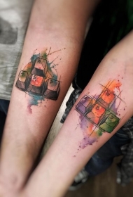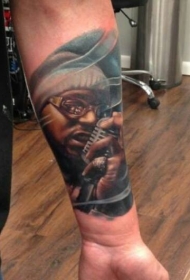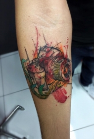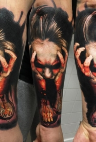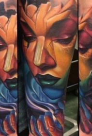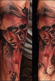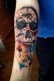 手臂超现实主义风格的彩色骷髅与时钟纹身