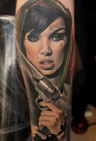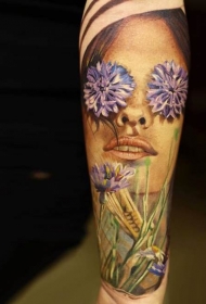 手臂现实主义风格的彩色妇女与鲜花纹身